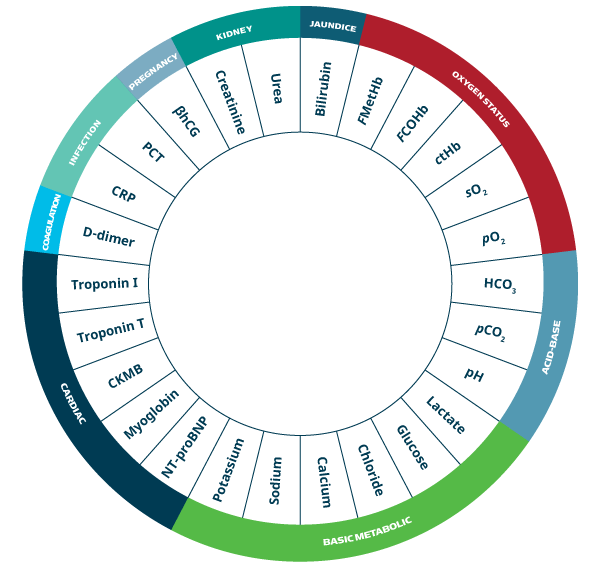 Überblick über einige der relevanten Parameter, die mit der POCT-Lösung von Radiometer in der Notaufnahme gemessen werden können. Erfahren Sie ausserdem, welche Parameter Ihnen mit unseren Lösungen für das Point-of-Care-Testing auf der Intensivstation sowie der Früh- und Neugeborenenintensivstation zur Verfügung stehen.