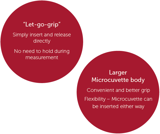 Avec le système « Let-Go-Grip » unique, il suffit de poser la microcuvette et de relâcher immédiatement. Il n’est pas nécessaire de maintenir la microcuvette ni de l’enfoncer pour obtenir le résultat - il suffit d'appuyer et de relâcher.