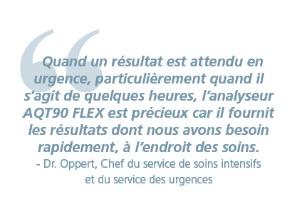 Le Dr. Oppert explique aussi : « Avec l'analyseur AQT90 FLEX, l'analyse de la PCT est rapide et facile. Il n'est pas nécessaire de faire passer le plasma du tube et de la pipette dans un autre récipient. Cela est très important dans un service des urgences surchargé. Il suffit de prélever un échantillon sanguin, de placer le tube dans l'analyseur et d'appuyer sur Go. Des résultats précis et fiables peuvent être disponibles (et le document imprimé peut se retrouver dans les mains du médecin) en moins de 21 minutes. »